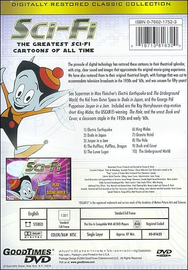 Science fiction has been a big seller from nearly the beginning of films, and these amazing sci fi cartoons will thrill and delight you. Enjoy entertainment such as Max Fleischer's Superman cartoons to "Dodo In Japan" featuring the Kid From Outer Space, as well as the "Jasper in a Jam" George Pal puppetoon and the Ray Harryhausen stop-motion "King Midas".