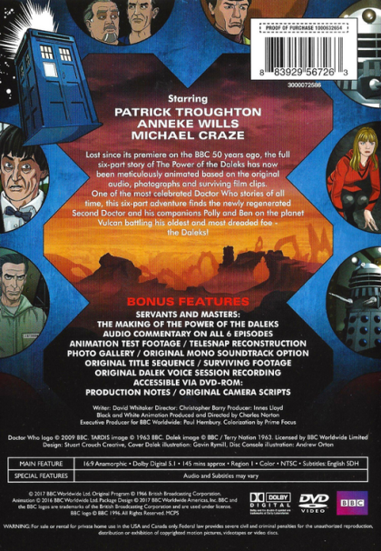 Lost since it's premiere on the BBC 50 years ago, the full six-part story of The Power of the Daleks has now been meticulously animated based on the original audio, photographs and surviving film clips. One of the most celebrated Doctor Who stories of all time, this six-part adventure finds the newly regenerated Second Doctor and his companions Polly and Ben on the planet Vulcan battling his oldest and most dreaded foe - the Daleks!