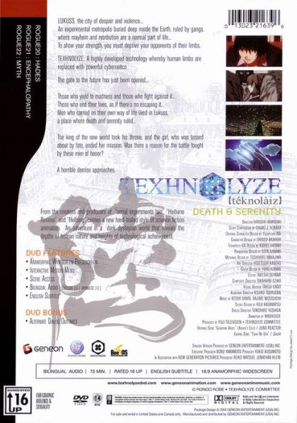 LUKUSS, the city of despair and violence...An experimental metropolis buried deep inside the Earth, ruled by gangs, where mayhem and retribution are a normal part of life...To show your strength, you must deprive your opponents of their limbs.TEXHNOLYZE: A highly developed technology whereby human limbs are replaced with powerful cyberneticsThe gate to the future has just been opened...Those who yield to madness and those who fight against it...Those who end their lives, as if there is no escaping it... Men who carried on their own way of life lived in Lukuss, a place where death and serenity ruled...The king of the new world took his throne, and the girl, who was tossed about by fate, ended her mission. Was there a reason for the battle fought by these men of honor?A horrible demise approaches.