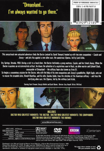 This sensational new animated adventure finds the Doctor (voiced by David Tennant) hooked up with two new companions – Cassie and Jimmy – and pits him against a new alien race, the monstrous Viperox, led by Lord Azlok. Day Springs, Nevada, 1958. During a visit to a local diner, the Doctor befriends a young waitress, Cassie, and her friend Jimmy. When the Doctor examines an extraterrestrial artefact, he draws the attention of a mysterious man in black, an alien warrior and Colonel Stark, commanderof Dreamland – the military base also known as Area 51. So begins a momentous mission for the Doctor, who with the help of his new companions and Jimmy’s grandfather, Night Eagle, sets out to rescue the stranded alien, Rivesh Mantilax, and his wife, Saruba Valek, from the clutches of the American military – and from the terrifying alien race, the Viperox, led by the ruthless Lord Azlok.