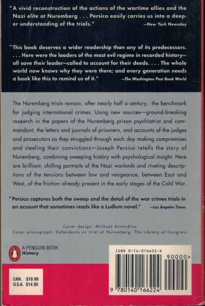 "A vivid reconstruction of the actions of the wartime allies and the Nazi elite at Nuremberg. Persico easily carries us into a deeper understanding of the trials."—New York NewsdayThe Nuremberg trials remain, after nearly half a century, the benchmark for judging international crimes. Using new sources—groundbreaking research in the papers of the Nuremberg prison psychiatrist and commandant, the letters and journals of prisoners, and accounts of the judges and prosecutors as they struggled through each day making compromises and steeling their convictions—Joseph Persico retells the story of Nuremberg, combining sweeping history with psychological insight. Here are brilliant, chilling portraits of the Nazi warlords and riveting descriptions of the tensions between law and vengeance, between East and West, of the friction already present in the early stages of the Cold War.