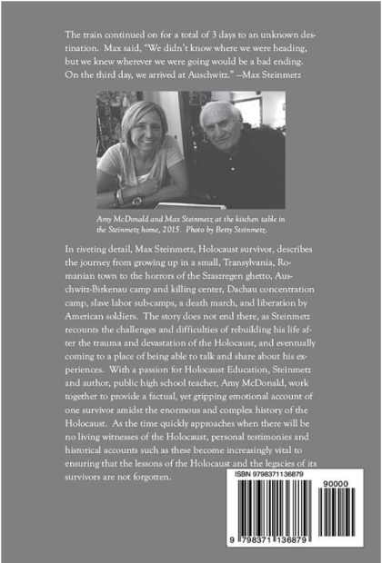 In riveting detail, Max Steinmetz, Holocaust survivor, describes the journey from growing up in a small, Romanian town to the horrors of the Szaszregen Ghetto, Auschwitz-Birkenau camp and killing center, Dachau concentration camp, slave labor sub-camps, a death march, and liberation by American soldiers. The story does not end there, as Steinmetz recounts the challenges and difficulties of rebuilding his life after the trauma and devastation of the Holocaust, and eventually coming to a place of being able to talk and share about his experiences. With a passion for Holocaust Education, Steinmetz and author, public high school teacher, Amy McDonald, work together to provide a factual, yet gripping emotional account of one survivor amidst the enormous and complex history of the Holocaust. As the time quickly approaches when there will be no living witnesses of the Holocaust, personal testimonies and historical accounts such as these become increasingly vital to ensuring that the lessons of the Holocaust and the legacies of its survivors are not forgotten.