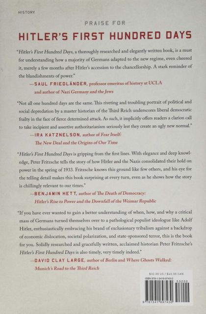 This unsettling and illuminating history reveals how Germany's fractured republic gave way to the Third Reich, from the formation of the Nazi party to the rise of Hitler.Amid the ravages of economic depression, Germans in the early 1930s were pulled to political extremes both left and right. Then, in the spring of 1933, Germany turned itself inside out, from a deeply divided republic into a one-party dictatorship. In Hitler's First Hundred Days, award-winning historian Peter Fritzsche offers a probing account of the pivotal moments when the majority of Germans seemed, all at once, to join the Nazis to construct the Third Reich. Fritzsche examines the events of the period -- the elections and mass arrests, the bonfires and gunfire, the patriotic rallies and anti-Jewish boycotts -- to understand both the terrifying power the National Socialists exerted over ordinary Germans and the powerful appeal of the new era they promised.Hitler's First Hundred Days is the chilling story of the beginning of the end, when one hundred days inaugurated a new thousand-year Reich.