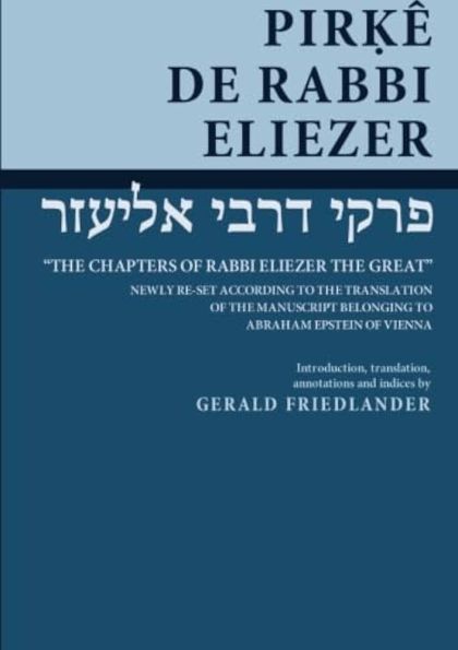 Pirkei DeRabbi Eliezer (Chapters of Rabbi Eliezer) is a midrash that retells and expands upon the biblical narrative, from the beginning of the Book of Genesis through the story of Miriam’s leprosy in the Book of Numbers. It includes topics such as ethics, ancient Jewish customs and legends, and calculations regarding both creation and the end of days. Traditionally ascribed to Rabbi Eliezer ben Hyrcanus, a 2nd-century sage, the work was likely edited in the eighth or ninth century.