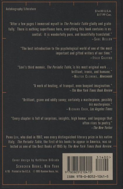 The Periodic Table is largely a memoir of the years before and after Primo Levi’s transportation from his native Italy to Auschwitz as an anti-Facist partisan and a Jew.It recounts, in clear, precise, unfailingly beautiful prose, the story of the Piedmontese Jewish community from which Levi came, of his years as a student and young chemist at the inception of the Second World War, and of his investigations into the nature of the material world. As such, it provides crucial links and backgrounds, both personal and intellectual, in the tremendous project of remembrance that is Levi’s gift to posterity. But far from being a prologue to his experience of the Holocaust, Levi’s masterpiece represents his most impassioned response to the events that engulfed him.The Periodic Table celebrates the pleasures of love and friendship and the search for meaning, and stands as a monument to those things in us that are capable of resisting and enduring in the face of tyranny.
