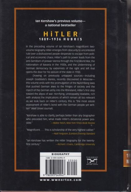 "Hailed as the most compelling biography of the German dictator yet written, Ian Kershaw's Hitler brings us closer than ever before to the heart of its subject's immense darkness. From his illegitimate birth in a small Austrian village to his fiery death in a bunker under the Reich chancellery in Berlin, Adolf Hitler left a murky trail, strewn with contradictory tales and overgrown with self-created myths. One truth prevails: the sheer scale of the evils that he unleashed on the world has made him a demonic figure without equal in this century. Ian Kershaw's Hitler brings us closer than ever before to the character of the bizarre misfit in his thirty-year ascent from a Viennese shelter for the indigent to uncontested rule over the German nation that had tried and rejected democracy in the crippling aftermath of World War I. With extraordinary vividness, Kershaw recreates the settings that made Hitler's rise possible: the virulent anti-Semitism of prewar Vienna, the crucible of a war with immense casualties, the toxic nationalism that gripped Bavaria in the 1920s, the undermining of the Weimar Republic by extremists of the Right and the Left, the hysteria that accompanied Hitler's seizure of power in 1933 and then mounted in brutal attacks by his storm troopers on Jews and others condemned as enemies of the Aryan race. In an account drawing on many previously untapped sources, Hitler metamorphoses from an obscure fantasist, a 'drummer' sounding an insistent beat of hatred in Munich beer halls, to the instigator of an infamous failed putsch and, ultimately, to the leadership of a ragtag alliance of right-wing parties fused into a movement that enthralled the German people. This volume, the first of two, ends with the promulgation of the infamous Nuremberg laws that pushed German Jews to the outer fringes of society, and with the march of the German army into the Rhineland, Hitler's initial move toward the abyss of war"--Amazon.com.