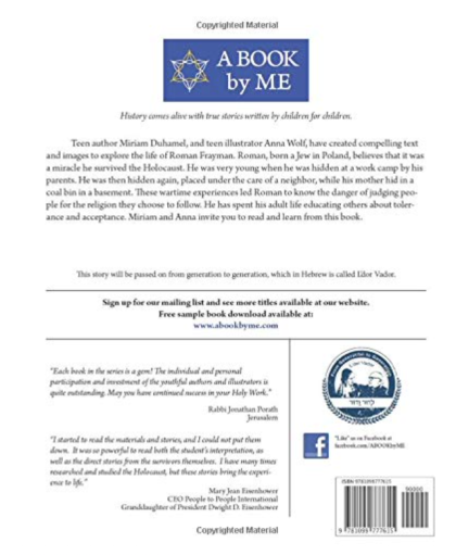 Teen author Miriam Duhamel, and teen illustrator Anna Wolf, have created compelling text and images to explore the life of Roman Frayman. Roman, born a Jew in Poland, believes that it was a miracle he survived the Holocaust. He was very young when he was hidden at a work camp by his parents. He was then hidden again, placed under the care of a neighbor, whilehis mother hid in a coal bin in a basement. These wartime experiences led Roman to know the danger of judging people for the religion they choose to follow. He has spent his adult life educating others about tolerance and acceptance. Miriam and Anna invite you to read and learn from this book.