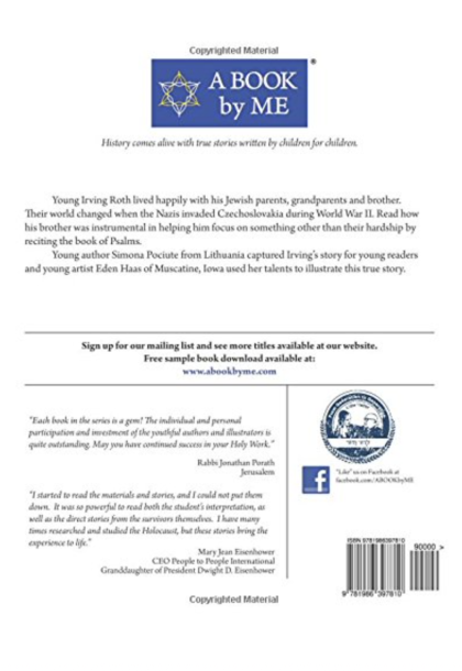 Young Irving was too young to understand what was happening when the Nazis occupied his region of Czechoslovakia. His simple, happy childhood was over when antisemitism spread quickly. On his 9th birthday in 1940, Irving was excited to go to his first day of sixth grade. On his way to school, he saw a sign in front of the park which said, “Jews and dogs are forbidden to enter.” As he came closer to school, he saw the principal of the school standing outside with a group of children around him. All the children had yellow stars on their shirts. The principal said: “You cannot go to this school because you are Jewish.” Later that day, Irving wanted to play soccer with his friends, but he was confronted by his teammates who refused to let him play on their team. Next Jews, including Irving and his family, were put into cattle cars and shipped to Auschwitz concentration camp. Young Irving and his brother survived the horrors of the camp and were part of the death march led by the Nazis.Weak and exhausted, it was clear to the brothers, “You march or you die.” The march seemed to last forever, and they could not go a couple of feet without seeing a dead body. Irving’s brother Andre encouraged him, asking him to recite the book of Psalms of the Bible to take his mind off his hunger and weariness. A young author from Lithuania wrote this powerful story and a girl from Iowa did the amazing artwork that makes it even more compelling.