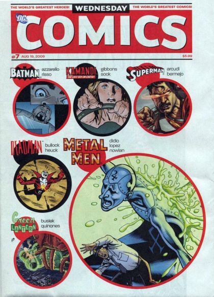 WEDNESDAY COMICS, DC's spectacular 12-issue weekly series, continues to offer a comics experience unlike any other this August. In its second month, don't miss the action in these continuing features: ? THE METAL MEN encounter a deadly guest-villain in a story written by Dan DiDio with art by Jose Luis Garcia-Lopez. ? THE FLASH battles Gorilla Grodd and tries to date Iris West in a story written by Karl Kerschl (TEEN TITANS YEAR ONE, THE FLASH: THE FASTEST MAN ALIVE) and Brenden Fletcher with art by Karl Kerschl. ? SUPERGIRL attempts to deal with Streaky and Krypto gone bad in a story written by Jimmy Palmiotti (JONAH HEX) with art by Amanda Conner (POWER GIRL). ? GREEN LANTERN must help a fellow test pilot whose space mission has transformed him into a monster in a story written by Kurt Busiek (TRINITY, ASTRO CITY) with art by Joe Qui?ones (TEEN TITANS GO!). ? SUPERMAN questions his heroic mission while on a trip to Smallville in a story written by John Arcudi (The Mask) with art by Lee Bermejo (JOKER). ? ADAM STRANGE takes a truly twisted journey into space in a story by writer/artist Paul Pope (BATMAN: YEAR 100). ? WONDER WOMAN is lost in a dream world in search of her lost tiara, bracelets and magic lasso in a story written and illustrated by Ben Caldwell (Dare Detectives). ? THE TEEN TITANS are attacked by Trident in a story written by Eddie Berganza with art by Sean Galloway. Plus: ? BATMAN, WEDNESDAY COMICS' weekly cover feature, by the Eisner Award-winning 100 BULLETS team of writer Brian Azzarello and artist Eduardo Risso. ? METAMORPHO, written by New York Times best-selling writer Neil Gaiman with art by Eisner Award-winner Michael Allred (Madman). ? THE DEMON AND CATWOMAN, written by Walter Simonson (Thor, MANHUNTER) with art by famed DC cover artist Brian Stelfreeze. ? DEADMAN, written by Dave Bullock and Vinton Heuck, art by Dave Bullock. ? KAMANDI, written by Dave Gibbons (WATCHMEN, GREEN LANTERN CORPS) with art by Ryan Sook (Buffy The Vampire Slayer, ARKHAM ASYLUM: LIVING HELL). ? HAWKMAN, written and illustrated by Kyle Baker (PLASTIC MAN, Special Forces). ? SGT. ROCK, written by Adam Kubert (SUPERMAN: LAST SON), ilustrated by legendary comics artist Joe Kubert. WEDNESDAY COMICS will arrive in stores folded twice to 7' x 10'. Issue #5 on sale August 5; Issue #6 on sale August 12; Issue #7 on sale August 19; Issue #8 on sale August 26 5-8 of 12 ? 7' x 10', 16 pg, FC, $3.99 US