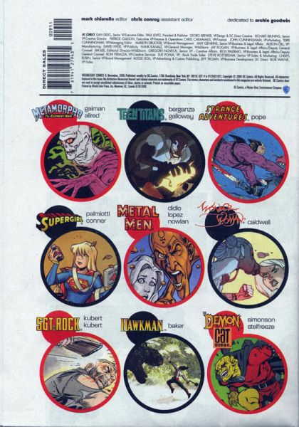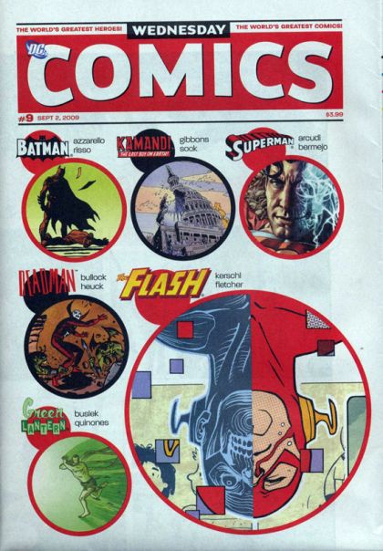 WEDNESDAY COMICS, DC's new, 12-issue weekly series, reaches its incredible conclusion in September. Here are just some of the highlights of this third and final month: ? In BATMAN, WEDNESDAY COMICS' weekly cover feature, Bruce Wayne digs further into a steamy murder mystery. It's a classic noir tale by the Eisner Award-winning 100 BULLETS team of writer Brian Azzarello and artist Eduardo Risso. ? METAMORPHO dives into a fever-dream of an adventure, written by New York Times best-selling writer Neil Gaiman with art by Eisner Award-winner Michael Allred (Madman). ? THE DEMON AND CATWOMAN make a deadly detour after Selina Kyle attempts to rob Jason Blood's collection of antiquities, taking her into unexpected territory. Written by Walter Simonson (Thor, MANHUNTER) with art by famed DC cover artist Brian Stelfreeze. ? DEADMAN is warned off of pursuing a serial killer by the only being who could do so: Rama Kushna. It's a tale of mystery and mystics written by Dave Bullock and Vinton Heuck, art by Dave Bullock. ? KAMANDI explores the living nightmare that is the world after the Great Disaster in a sprawling tale written by Dave Gibbons (WATCHMEN, GREEN LANTERN CORPS) with art by Ryan Sook (Buffy The Vampire Slayer, ARKHAM ASYLUM: LIVING HELL). ? The feathers fly as HAWKMAN heads into slam-bang action, as written and illustrated by Kyle Baker (PLASTIC MAN, Special Forces). ? SGT. ROCK is captured by German forces - but will the Rock break? Find out in a gritty wartime epic written by Adam Kubert (SUPERMAN: LAST SON) and ilustrated by legendary comics artist Joe Kubert. And don't miss these continuing features: ? THE METAL MEN, written by Dan DiDio with art by Jose Luis Garcia-Lopez. ? THE FLASH, written by Karl Kerschl (TEEN TITANS YEAR ONE, THE FLASH: THE FASTEST MAN ALIVE) and Brenden Fletcher with art by Karl Kerschl. ? SUPERGIRL, written by Jimmy Palmiotti (JONAH HEX) with art by Amanda Conner (POWER GIRL). ? GREEN LANTERN, written by Kurt Busiek (TRINITY, ASTRO CITY) with art by Joe Qui?ones (TEEN TITANS GO!). ? SUPERMAN, written by John Arcudi (The Mask) with art by Lee Bermejo (JOKER). ? ADAM STRANGE, written and illustrated by Paul Pope (BATMAN: YEAR 100). ? WONDER WOMAN, written and illustrated by Ben Caldwell (Dare Detectives). ? THE TEEN TITANS, written by Eddie Berganza with art by Sean Galloway. WEDNESDAY COMICS will arrive in stores folded twice to 7' x 10'. On sale September 2 ? #9 of 12 ? 7' x 10', 16 pg, FC, $3.99 US