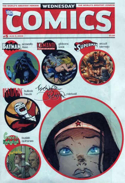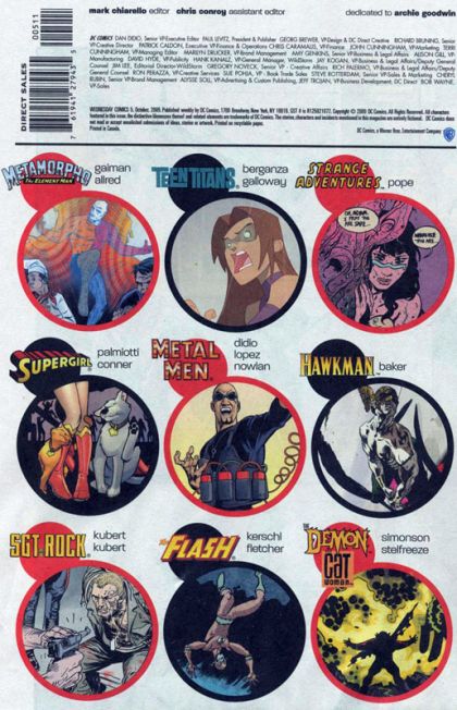 WEDNESDAY COMICS, DC's spectacular 12-issue weekly series, continues to offer a comics experience unlike any other this August. In its second month, don't miss the action in these continuing features: ? THE METAL MEN encounter a deadly guest-villain in a story written by Dan DiDio with art by Jose Luis Garcia-Lopez. ? THE FLASH battles Gorilla Grodd and tries to date Iris West in a story written by Karl Kerschl (TEEN TITANS YEAR ONE, THE FLASH: THE FASTEST MAN ALIVE) and Brenden Fletcher with art by Karl Kerschl. ? SUPERGIRL attempts to deal with Streaky and Krypto gone bad in a story written by Jimmy Palmiotti (JONAH HEX) with art by Amanda Conner (POWER GIRL). ? GREEN LANTERN must help a fellow test pilot whose space mission has transformed him into a monster in a story written by Kurt Busiek (TRINITY, ASTRO CITY) with art by Joe Qui?ones (TEEN TITANS GO!). ? SUPERMAN questions his heroic mission while on a trip to Smallville in a story written by John Arcudi (The Mask) with art by Lee Bermejo (JOKER). ? ADAM STRANGE takes a truly twisted journey into space in a story by writer/artist Paul Pope (BATMAN: YEAR 100). ? WONDER WOMAN is lost in a dream world in search of her lost tiara, bracelets and magic lasso in a story written and illustrated by Ben Caldwell (Dare Detectives). ? THE TEEN TITANS are attacked by Trident in a story written by Eddie Berganza with art by Sean Galloway. Plus: ? BATMAN, WEDNESDAY COMICS' weekly cover feature, by the Eisner Award-winning 100 BULLETS team of writer Brian Azzarello and artist Eduardo Risso. ? METAMORPHO, written by New York Times best-selling writer Neil Gaiman with art by Eisner Award-winner Michael Allred (Madman). ? THE DEMON AND CATWOMAN, written by Walter Simonson (Thor, MANHUNTER) with art by famed DC cover artist Brian Stelfreeze. ? DEADMAN, written by Dave Bullock and Vinton Heuck, art by Dave Bullock. ? KAMANDI, written by Dave Gibbons (WATCHMEN, GREEN LANTERN CORPS) with art by Ryan Sook (Buffy The Vampire Slayer, ARKHAM ASYLUM: LIVING HELL). ? HAWKMAN, written and illustrated by Kyle Baker (PLASTIC MAN, Special Forces). ? SGT. ROCK, written by Adam Kubert (SUPERMAN: LAST SON), ilustrated by legendary comics artist Joe Kubert. WEDNESDAY COMICS will arrive in stores folded twice to 7' x 10'. Issue #5 on sale August 5; Issue #6 on sale August 12; Issue #7 on sale August 19; Issue #8 on sale August 26 5-8 of 12 ? 7' x 10', 16 pg, FC, $3.99 US