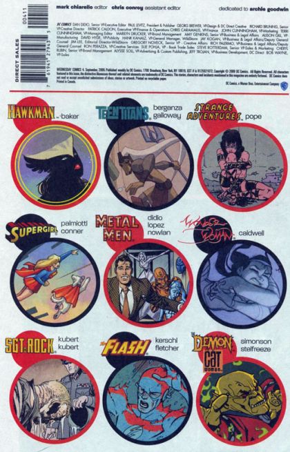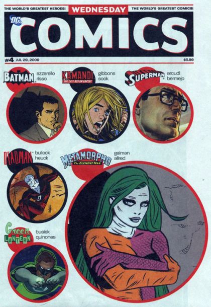 WEDNESDAY COMICS #1-4 In July, DC Comics gives a fresh twist to a grand comics tradition with WEDNESDAY COMICS, a new, weekly 12-issue series by some of the greatest names in comics today! WEDNESDAY COMICS is unique in modern comics history: Reinventing the classic weekly newspaper comics section, it is a 16-page weekly that unfolds to a sprawling 28' x 20' tabloid-sized reading experience bursting with mind-blowing color, action and excitement, with each feature on its own 14' x 20' page. Spearheaded by DCU Editorial Art Director Mark Chiarello, whose past editing credits include BATMAN BLACK & WHITE, DC: THE NEW FRONTIER and SOLO, each page of WEDNESDAY COMICS spotlights the continuing adventures of DC heroes, including: o BATMAN, WEDNESDAY COMICS' weekly cover feature, by the Eisner Award-winning 100 BULLETS team of writer Brian Azzarello and artist Eduardo Risso o ADAM STRANGE, by writer/artist Paul Pope (BATMAN: YEAR 100) o METAMORPHO, written by New York Times best-selling writer Neil Gaiman with art by Eisner Award-winner Michael Allred (Madman) o THE DEMON AND CATWOMAN, written by Walter Simonson (Thor, MANHUNTER) with art by famed DC cover artist Brian Stelfreeze o DEADMAN, written by Dave Bullock and Vinton Heuck, art by Dave Bullock o KAMANDI, written by Dave Gibbons (WATCHMEN, GREEN LANTERN CORPS) with art by Ryan Sook (Buffy The Vampire Slayer, ARKHAM ASYLUM: LIVING HELL) o SUPERMAN, written by John Arcudi (The Mask) with art by Lee Bermejo (JOKER) o WONDER WOMAN, written and illustrated by Ben Caldwell (Dare Detectives) o GREEN LANTERN, written by Kurt Busiek (TRINITY, ASTRO CITY) with art by Joe Qui?ones (TEEN TITANS GO!) o TEEN TITANS, written by Eddie Berganza with art by Sean Galloway o SUPERGIRL, written by Jimmy Palmiotti (JONAH HEX) with art by Amanda Conner (POWER GIRL) o HAWKMAN, written and illustrated by Kyle Baker (PLASTIC MAN, Special Forces) o SGT. ROCK, written by Adam Kubert (SUPERMAN: LAST SON), ilustrated by legendary comics artist Joe Kubert o THE FLASH, written by Karl Kerschl (TEEN TITANS YEAR ONE, THE FLASH: THE FASTEST MAN ALIVE) and Brenden Fletcher, illustrated by Karl Kerschl o METAL MEN, written by Dan DiDio with art by Ian Churchill (SUPERGIRL) WEDNESDAY COMICS will arrive in stores folded twice to 7' x 10', with the first issue set to reach stores on July 8. On sale July 29 o 4 of 12 o 7' x 10', 16 pg, FC, $3.99 US