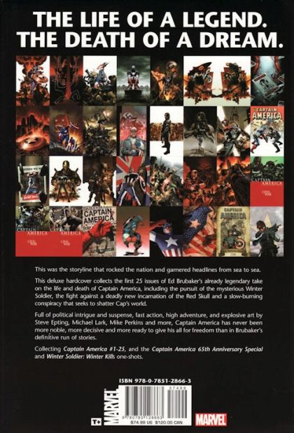 written by Ed Brubaker; penciled by Steve Epting, Mike Perkins, Michael Lark, Marcos Martin & Lee Weeks; cover by Epting From Marvel Comics. Collecting Eisner Award-nominated Best Writer Ed Brubaker's first 25 landmark issues of Captain America in one titanic tome, plus the Captain America 65th Anniversary Special and Winter Soldier: Winter Kills one-shots! This deluxe hardcover, fat-packed with extras, features the story that stunned readers worldwide and sent shockwaves through the entire Marvel Universe: the death of Captain America! Also including the return of Cap's wartime partner, Bucky Barnes, as the Winter Soldier; the death and life of his greatest enemy, the Red Skull; and the emergences of a new threat, General Aleksander Lukin, the head of one of the most powerful corporations in the world! Collecting Captain America #1-#25, Captain America 65th Anniversary Special and Winter Soldier: Winter Kills. Scheduled to ship 11/28/07. (161)