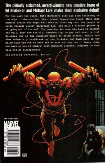 The critically acclaimed, award-winning new creative team of Ed Brubaker and Michael Lark make their explosive debut in a storyline that Daredevil fans will not be able to put down! For the past few years, Matt Murdock's life has been teetering on the edge of destruction. Now, pushed beyond the limit, Matt finds himself behind the eight ball with no clear way out, the people he calls friends slowly deserting him, and Hell's Kitchen gradually slipping out of control. The question is, when his back is against the wall, just how far will Daredevil go to get back what is his? Spinning out of the stunning finale of Bendis and Maleev's ground-breaking run, Brubaker and Lark pick up the billy club and run as hard and as fast as they can to leave their own mark on one of comics' most enduring legends. Longtime DD fans will not be disappointed! Collects Daredevil #82-87.