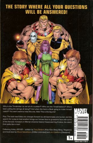 Written by TONY BEDARD Penciled by MIZUKI SAKAKIBARA & JAMES CALAFIORE Cover by MIKE MCKONE The story where all your questions will be answered! Why is the Timebroker so evil all of a sudden?! Who are the Timebreakers?! Who's been pulling the strings all along?! And when the heck is Beak going to make himself useful?! You won't want to miss this one, folks! This is the big one! Plus: The bold new Exiles era charges forward as old teammates are buried, and the search for a way to heal another brings our heroes face to gruesome face with some of the fiercest monsters in Marvel Universe history! Guest-starring Krakoa, the island that walks like a man! Collects EXILES #62-68.