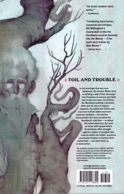 Written by BILL WILLINGHAM Art by MARK BUCKINGHAM, STEVE LEIALOHA, JIM FERN, CRAIG HAMILTON and DAVID LAPHAM Cover by JOAO RUAS While the meek flying monkey Bufkin is trapped in Fabletown's collapsed business office with the evil witch Baba Yaga, Frau Totenkinder and the witches of the Woodland's thirteenth floor prepare to deal with Mister Dark in what's left of Fabletown. Collecting FABLES #86-93!