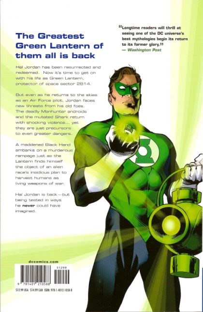 Written by Geoff Johns Art by Carlos Pacheco, Ethan Van Sciver, Darwyn Cooke and others Cover by Alex Ross A softcover edition collecting GREEN LANTERN #1-6 and GREEN LANTERN SECRET FILES #1! Hal Jordan is back from the dead - now watch as he reestablishes his life as a pilot. Standing in his way, though, is one of the deadly Manhunter androids followed by the Shark. Advance-solicited; on sale May 7 ? 176 pg, FC, $12.99 US