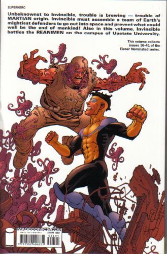 Invincible battles the REANIMEN on the campus of Upstate University. Meanwhile, unbeknownst to him trouble is brewing--trouble of MARTIAN origin. Invincible must assemble a team of Earth's mightiest defenders to go out into space and prevent what could well be the end of mankind! Collects INVINCIBLE #36-41.