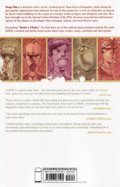 Tony Chu is a detective with a secret. A weird secret. Tony Chu is Cibopathic, which means he gets psychic impressions from whatever he eats. It also means he's a hell of a detective, as long as he doesn't mind nibbling on the corpse of a murder victim to figure out whodunit, and why. He's been brought on by the Special Crimes Division of the FDA, the most powerful law enforcement agency on the planet, to investigate their strangest, sickest, and most bizarre cases. Collects CHEW #1-5.