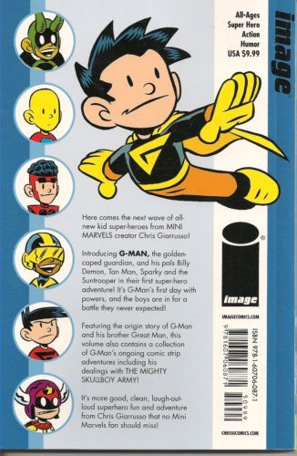 story CHRIS GIARRUSSO art & cover CHRIS GIARRUSSO From the creator of the sold-out MINI-MARVELS digests comes the first G-MAN digest! Writer/artist CHRIS GIARRUSSO continues his signature Mini Marvels brand of comics with G-Man and his pals, the next wave of all-new kid super-heroes! Collects the sold-out G-Man one-shot, the G-Man Christmas story, an extensive collection of COMIC BITS comic strips and more!