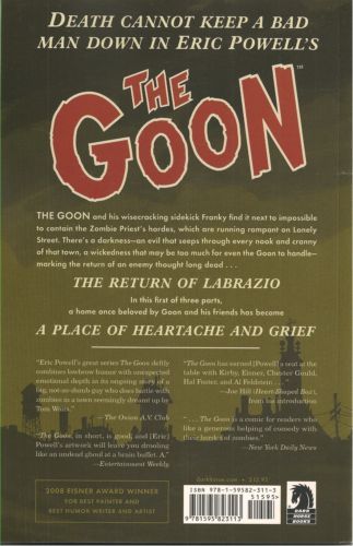 Eric Powell (W/A) An ancient curse spreads hatred, fear, and violence, drawing the most powerful and vile creatures to a town with only one hope for protection-the Goon. Even the Goon's lifelong deadly foe, the zombie priest, is running scared. But he has to remain, forced into submission by a power greater than his own, to keep an eye on Goon and his violent sidekick, Franky. The death of one of the Goon's closest allies reveals an enemy thought long gone, returned to wreak havoc and destruction upon the Goon and those who stand by him. There's some funny stuff, too! o Collects the first part of Goon Year (#19-#23): The Return of Labrazio!