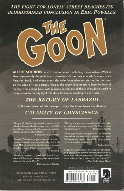 Eric Powell (W/A) Multiple Eisner Award-winning creator of The Goon Eric Powell teams with acclaimed colorist Dave Stewart to bring this tale of humor, horror, and heartbreak to a close. Prepare for the usual weirdness, as only Powell and The Goon can provide: the living dead (children, priests, and pretty ladies), pretty living ladies, gypsies, backwoods children . . . 'dogs' . . . crazy-weird cats, pimps peddling animal love, animals on the receiving end of said animal love . . . evil Shredded Wheat-men, more-evil undead burlesque-house owners, guys with tails, a woky (a woky?) . . . and more! o The Goon Volume 9 collects the final installment of Goon Year (issues #28-#31)! o ' . . . mobsters and zombies in a world that looks like Sin City channeled by E. C. Segar's Popeye universe.' -Los Angeles Times