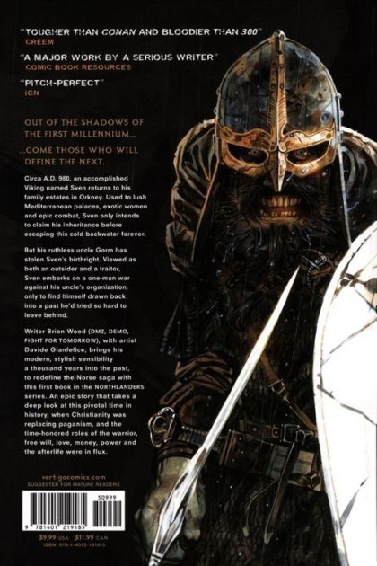 Written by Brian Wood Art by Davide Gianfelice Cover by Massimo Carnevale In this first volume collecting NORTHLANDERS #1-8, DMZ writer Brian Wood stabs Viking lore in the face with a fresh take on what it means to be a warrior. Meet Sven, an exiled Viking prince who must return to the desolate lands of his birth to reclaim his vast inheritance upon the death of his father. See why Entertainment Weekly calls it 'a well-reserched, richly realized world that illuminates politics and culture without getting bogged down in history-book stuff.' Advance-solicited; on sale October 1 ? 200 pg, FC, $9.99 US ? MATURE READERS