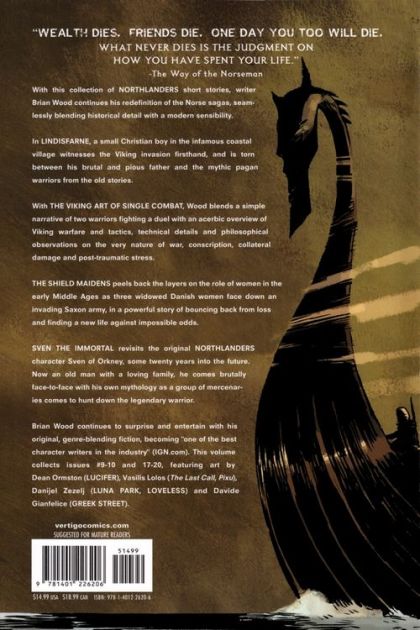 Blood In The Snow: In LINDISFARNE, a small Christian boy in the infamous coastal village witnesses the Viking invasion firsthand, and is torn between his brutal and pious father and the mythic pagan warriors from the old stories. With THE VIKING ART OF SINGLE COMBAT, Wood blends a simple narrative of two warriors fighting a duel with an acerbic overview of Viking warfare and tactics, technical details and philosophical observations on the very nature of war, conscription, collateral damage and post-traumatic stress. THE SHIELD MAIDENS peels back the layers on the role of women in the early Middle Ages as three widowed Danish women face down an invading Saxon army, in a powerful story of bouncing back from loss and finding a new life against impossible odds. SVEN THE IMMORTAL revisits the original NORTHLANDERS character Sven of Orkney, some twenty years into the future. Now an old man with a loving family, he comes brutally face-to-face with his own mythology as a group of mercenaries comes to hunt down the legendary warrior.