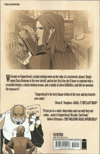 'Copperhead is the best Image debut of the year and my favorite new comic.' - Brian K. Vaughan (SAGA, Y - THE LAST MAN) Welcome to Copperhead, a grimy mining town on the edge of a backwater planet. Single mom Clara Bronson is the new sheriff, and on her first day she'll have to contend with a resentful deputy, a shady mining tycoon, and a family of alien hillbillies. And did we mention the massacre?