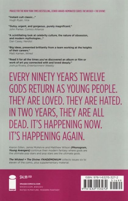 The critically-lauded best-selling hyphen-abusing series of stardom, divinity, and death returns with a second volume that's even grander than the first, because it contains six issues instead of five. THE FAUST ACT is over. Welcome to FANDEMONIUM. Includes cover gallery and anything else we'll cram in the back, because we just can't help ourselves. Collects THE WICKED + THE DIVINE #6-11