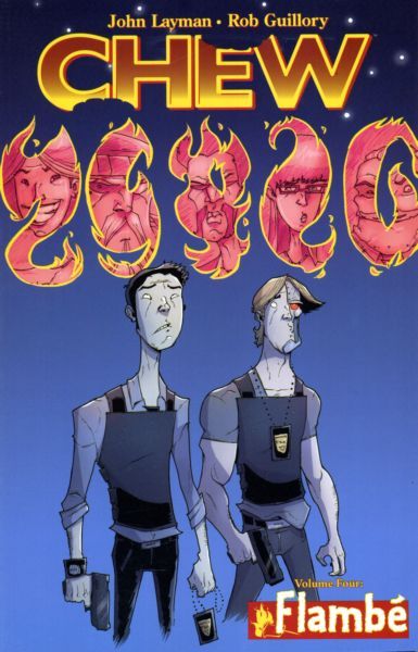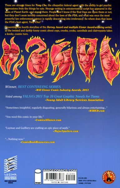 story JOHN LAYMAN art / cover ROB GUILLORY These are strange times for Tony Chu, the cibopathic federal agent with the ability to get psychic impressions from the things he eats. Strange writing in extraterrestrial script has appeared in the skies of Planet Earth-and stayed there. People don't know if the end days are upon them or not, but they don't seem terribly concerned about the laws of the FDA, and what was once the most powerful law enforcement agency is rapidly descending into irrelevancy. So where does that leave the FDA best agent, Tony Chu? Presenting the fourth story arc of the Eisner and Harvey Award-winner series, as the twisted and darkly funny comic about cops, crooks, cooks, cannibals and clairvoyants takes a curious cosmic turn. Collects CHEW #16-20