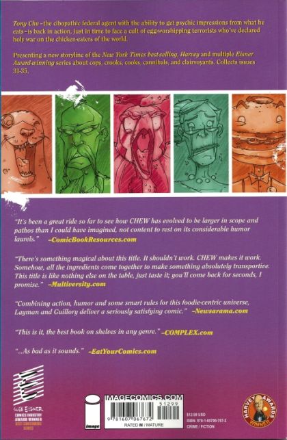 Presenting a new storyline of the New York Times Best Selling, Harvey and multiple Eisner Award-winner series about cops, crooks, cooks, cannibals, and clairvoyants. Tony Chu - the cibopathic federal agent with the ability to get psychic impressions from what he eats - is back in action, just in time to face a cult of egg-worshipping terrorists who've declared holy war on the chicken-eaters of the world. Collects CHEW # 31-35.