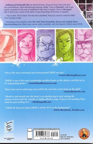 Anthony and Antonelle Chu are fraternal twins. Tony and Toni. Each with their own extraordinary, albeit diametrically opposed, ability. Tony is Cibopathic, able to get psychic sensations of the past of anything he bites into or ingests. Toni is Cibovoyant, able to flash onto a vision of the future of any living thing she bit into or ingested. Tony is alive. Toni is dead. Toni has been murdered. Tony has vowed to catch her killer. Toni is going to help. Presenting a new storyline of the New York Times Bestselling, Harvey and multiple Eisner Award-winning series about cops, crooks, cooks, cannibals, and clairvoyants.