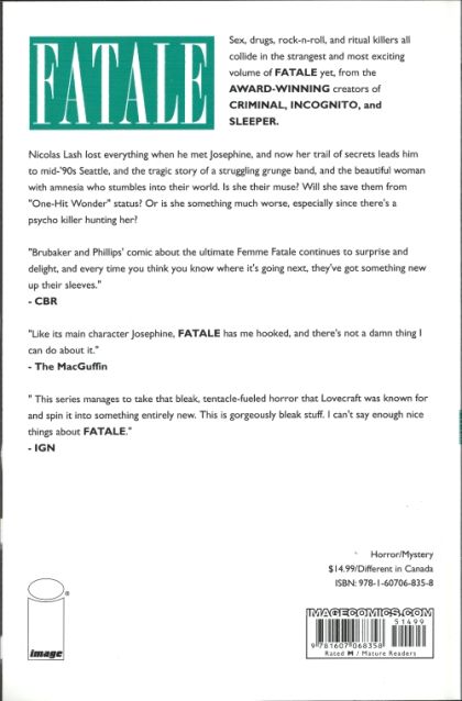 Sex, drugs, rock-n-roll, and ritual killers all collide in the strangest and most exciting volume of FATALE yet. A strange woman with no memory stumbles into the lives of a struggling grunge band in mid-'90s Seattle... Is she their muse? Will she save them from 'one-hit wonder' status? Or will she be something much worse, especially since there's a psycho killer on her trail? The newest volume of the New York Times Best-Selling series! Collects FATALE #15-19