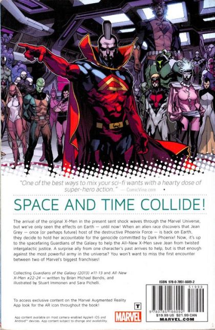 Space and time collide! The arrival of the original X-Men in the present sent shockwaves through the Marvel Universe, but we've only seen the effects on Earth - until now! When an alien race discovers that Jean Grey - once (or perhaps future) host of the destructive Phoenix Force - is back on Earth, they decide to hold her accountable for the genocide committed by Dark Phoenix! Now, it's up to the spacefaring Guardians of the Galaxy to help the All-New X-Men save Jean from twisted intergalactic justice. A surprise ally from one character's past arrives to help, but will that be enough against the most powerful army in the universe? Don't miss the first encounter between two of Marvel's biggest franchises! Collecting GUARDIANS OF THE GALAXY (2013) #11-13 and ALL-NEW X-MEN #22-24. Rated T