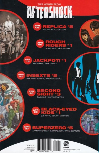 writer: Ray Fawkes artist: Marco Failla color: cover: Brian Stelfreeze Meet the World's Greatest Con Artists on the eve of the greatest scam in human history --ripping off the Gods themselves! The high-stakes, high-octane story of JACKPOT! begins here! Ray Fawkes, acclaimed creator of INTERSECT (writer of Gotham by Midnight and Batman: Eternal) teams up with Marco Failla (Spider-Man & the X-Men) to bring a new mind-bending, genre-busting monthly series from AfterShock!