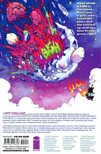 SPECIAL LOW INTRODUCTORY PRICE OF $9.99 From superstar writer and artist SKOTTIE YOUNG (Rocket Raccoon, Wizard of Oz, Fortunately, The Milk), comes the first volume of an all-new series of adventure and mayhem. An Adventure Time/Alice in Wonderland-style epic that smashes its cute little face against grown-up Tank Girl/Deadpool-esque violent madness. Follow Gert, a forty-year-old woman in a six-year-old's body, who has been stuck in the magical world of Fairyland for nearly thirty years. Join her and her giant battle-axe on a delightfully blood-soaked journey to see who will survive the girl who HATES FAIRYLAND. Collects I HATE FAIRYLAND #1-5