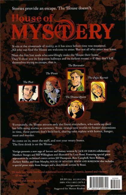 Written by Matthew Sturges and Bill Willingham Art by Luca Rossi, Ross Campbell, Sean Murphy, Zachary Baldus, Steve Rolston and Jill Thompson Cover by Sam Weber 'This is the next Vertigo pillar to watch!' - Wizard Welcome to the House of Mystery! Filled with peculiar, otherworldly characters from all walks of life, this series from Matthew Sturges (JACK OF FABLES) and Bill Willingham (FABLES) focuses on five people trapped in the reality-warping House of Mystery, a supernatural bar where tales are the legal tender and only the finest storytellers are patrons! But how - and why - they're stuck inside is all just a little piece of the puzzle in this first volume, which collects issues #1-5 of the all-new acclaimed series and special bonus material. Advance solicited; on sale January 14 ? 128 pg, FC $9.99 US MATURE READERS
