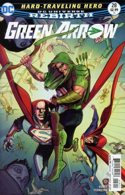 "HARD-TRAVELING HERO" part three! Metropolis is Oliver Queen's next stop on his quest to take down the Ninth Circle, but he may be too late when the evil financiers start a war with the one man they can't buy: Lex Luthor! That's more fat cats than even Ollie can handle, which means this is a job for Superman and Green Arrow!