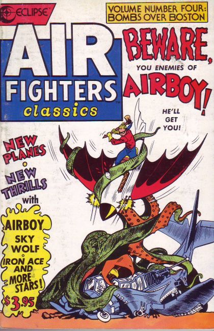 Cover by Charles Biro. Written by Charles Biro & Dick Wood, Nathaniel Nitkin and unknown. Art by Al Camy, Fred Kida, Tony DiPreta, Mort Leav, Pierce Rice & Arturo Casanueve, John Cassone and Bob Fujitani. Retouched art by Miyako Graham. Reprint of Air Fighters Comics Vol. 1 (1941-1943) #5, featuring: Airboy in "Bombs over Boston"; the mighty Thor in the Iron Ace story; a sub spotter in the Skinny McGinty story; flying dragons in the Skywolf story; 2-page text story "Ace of Aces"; an impostor in the Bald Eagle story; the Black Angel in "There Was the Hag from Hades"; and the man without a soul in the Flying Dutchman story! Softcover, 64 pages, full color. Cover price $3.95.