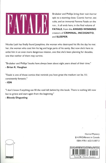 The final book in ED BRUBAKER and SEAN PHILLIPS's best-selling horror-noir epic. The secrets of the immortal Femme Fatale and her adversary come to light before their final explosive confrontation. Collects FATALE #20-24