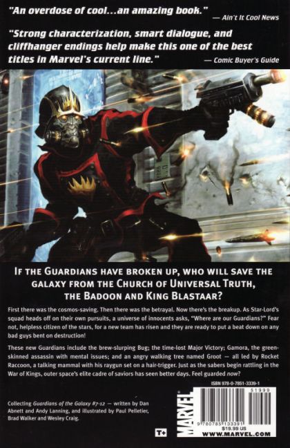 The Guardians of the Galaxy are fractured. Rocket Raccoon leads a group in combat against the Badoon, while Warlock and Gamora run their own agenda. Now working alone, Star-Lord tries to warn the Kree about the Skrull invasion, only to learn that Kree have already taken extreme steps to defend themselves against the threat. He finds himself sent to the Negative Zone, where he learns that Blastaar is now an even greater threat than he used to be.