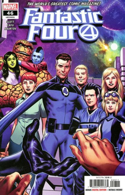 "FAMILY FIRST"! • Not a dream. Not a hoax. This is real. • Thanks to the knowledge of the Watchers, the lost daughter of Nathaniel Richards has been found. • It's time to finally meet the mysterious sister of Reed Richards. • But is it time to welcome her into the family? • It's a day of amazing adventures both in her world, and in the world of the Fantastic Four. • Guest-starring Namor, King of Atlantis. RATED T+