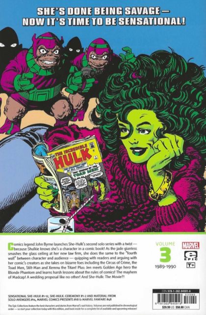 SHE’S DONE BEING SAVAGE — NOW IT’S TIME TO BE SENSATIONAL! Comics legend John Byrne launches She-Hulk’s second solo series with a twist — because Shulkie knows she’s a character in a comic book! As the jade giantess smashes the glass ceiling at her new law firm, she does the same to the “fourth wall” between character and audience — quipping with readers and arguing with her comic’s creators as she takes on bizarre foes including the Circus of Crime, the Toad Men, Stilt-Man and Xemnu the Titan! Plus: Jen meets Golden Age hero the Blonde Phantom and learns harsh lessons about the rules of comics! The mayhem of Madcap! A wedding proposal like no other! And She-Hulk: The Movie?! Collecting SENSATIONAL SHE-HULK #1-12, SHE-HULK: CEREMONY #1-2 AND MATERIAL FROM SOLO AVENGERS #14, MARVEL COMICS PRESENTS #18 & MARVEL FANFARE #48