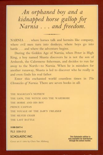 "This is the story of an adventure that happened in Narnia and Calormen and the lands between, in the Golden Age when Peter was High King in Narnia and his brother and his two sisters were King and Queens under him. It is during this glorious era in Narnian history that Shasta, a young boy living in Calormen with a cruel man who claims to be his father, dreams of traveling to the unknown North. One night he overhears his "father" offering to sell him as a slave, and Shasta decides that now is the time to begin his Journey. When he meets Bree, a Talking Horse of Narnia who is a slave himself, the two decide to escape together. The pair soon encounters Aravis, a highborn girl escaping a forced marriage, and Hwin, another Talking Horse. The travelers must combine their wits and all their strength to reach the freedom they long for. And when they discover a Calormene plot to conquer Narnia, they must also race against time."--