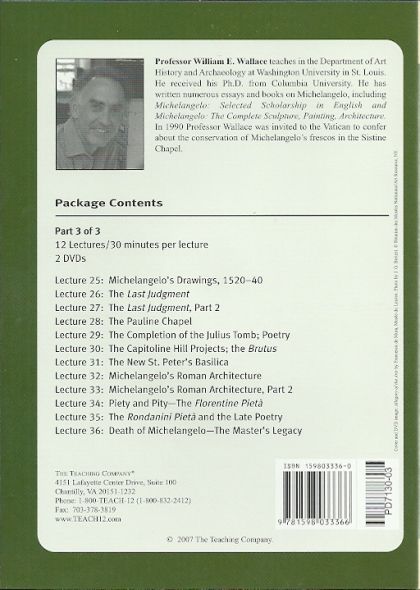In The Genius of Michelangelo, internationally recognized Michelangelo expert and award-winning Professor of Art History William E. Wallace gives you a comprehensive perspective on one of history's greatest artists. Drawing on a vast command of artistic knowledge and period detail, these 36 intellectually rewarding and visually dazzling lectures explore the relationship between truth and legend to reveal a groundbreaking new picture of Michelangelo as an artist, a businessman, an aristocrat, and a genius. Michelangelo's work is among the most well documented and well preserved in the history of art; the bulk of his output in sculpture, painting, and architecture survives to this day. The Genius of Michelangelo draws on the master's works, as well as a wealth of additional documentation that survives, to help reconstruct the details of Michelangelo's life. Arranged as a chronological survey of the artist's life, The Genius of Michelangelo presents a thorough understanding of Michelangelo's life and work, informed by a broad consideration of the artist and his times, as well as the specific circumstances and contexts in which he crafted his art. As you follow Michelangelo's rise, you learn to separate fact from fiction and to penetrate the myths that have long hampered a complete understanding of this unforgettable artist
