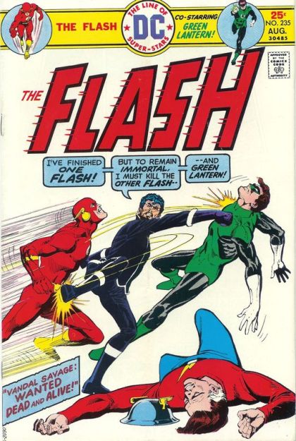Cover art by Dick Giordano. Vandal Savage--Wanted Dead and Alive!, script by Cary Bates, pencils by Irv Novick, inks by Tex Blaisdell; Vandal Savage kidnaps Iris and Carol to try to force Flash and Green Lantern to do his wishes. House ad for tabloid Famous 1st Editon Flash 1 and Limited Collectors' Edition Batman. Hostess baseball cards ad. 36 pgs. $0.25. Cover price $0.25.