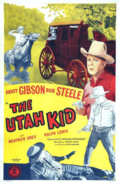 The Utah Kid was a late entry in Monogram's "Trail Blazers" series. These low-budget westerns usually featured three cowboy stars; this time, however, there are only two, Bob Steele and Hoot Gibson. Though neither star is a spring chicken, Steele is the younger of the two, so he's the "Utah Kid" by default. The plot, involving a gang of crooks who go around fixing rodeo results, was designed to accommodate yards and yards of stock footage.