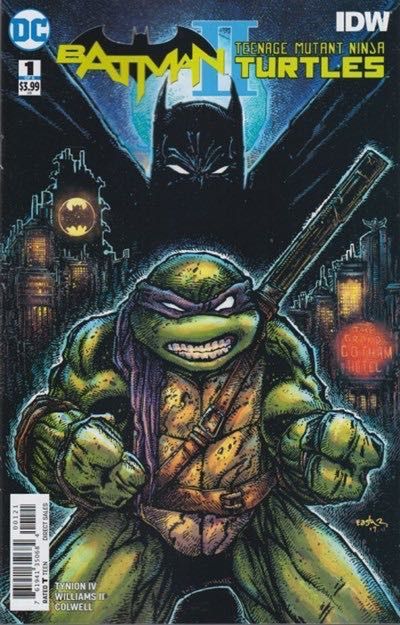 The team behind the smash-hit crossover series is back to reunite the Dark Knight and the Heroes in a Half-Shell. When Donatello goes looking for a new mentor to help him improve his fighting skills, he opens a doorway to another reality, hoping to summon the Turtles' one-time ally, Batman. But instead, he gets sent to Gotham City and someone else comes through the open portal-Bane! Suddenly, there's a new gang boss in New York and he's out to unite all the other bad guys under him. Can Donnie get back in time and bring Batman with him to help his brothers before Bane causes irreparable destruction? Co-published with IDW. RATED T