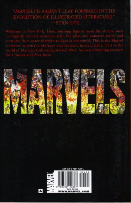 Written by KURT BUSIEK Penciled by ALEX ROSS Cover by ALEX ROSS 'MARVELS is a giant leap forward in the evolution of illustrated literature.' -- Stan Lee Welcome to New York. Here, burning figures roam the streets, men in brightly colored costumes scale the glass and concrete walls, and creatures from space threaten to devour our world. This is the Marvel Universe, where the ordinary and fantastic interact daily. This is the world of Marvels. Collecting MARVELS #0-4. 248 PGS./Rated A ?$24.99